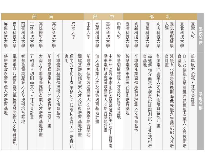 這一連串策略和行動,將技職教育導回實作、技術開發引領學習的本質,也成為「建置區域產業人才及技術培育基地計畫」的養分,投入二十四億元,打造二十座具備永續經營能力的基地。