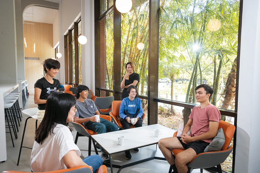 在設計師的巧思之下,各層樓原先被作為洗衣房的空間,改造為適合休憩喝咖啡的角落,「拿掉洗衣機,不只減少噪音,也讓轉角或走道的視線顯得更加寬闊;原先的空間擺上小吧臺和高腳椅,成為可以沈澱或三五好友聊天的空間。」林于竝非常喜歡這個設計,至於洗衣服需求,集中到頂樓的洗衣房,同樣設計一張大平台,讓同學們可以帶著電腦,在等待衣服洗完的時候有機會互相討論課業,或趁此機會和其他科系的學生聊天。