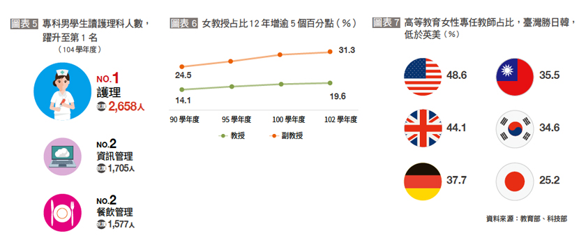 另一個有趣的現象是,近幾年專科學校中就讀護理科的男性有明顯成長(圖表5)。雖然目前護理工作仍以女性為主,但有越來越多男性跳脫傳統思維,可望在不久的將來扭轉該職業性別偏見。然而,近12年來,大專校院專任教師中的女性比率幾乎沒有增加,都在3成5左右,但教授與副教授職的女性比重,從90學年至102學年成長逾5個百分點(圖表6)。顯見在女性教育程度提高,以及高教師資需求擴增的情況下,向來以男性為主的高等教育教職領域,女性也逐漸占有一席之地。不過,若與先進國家相比,臺灣則還有進步空間(圖表7)。
